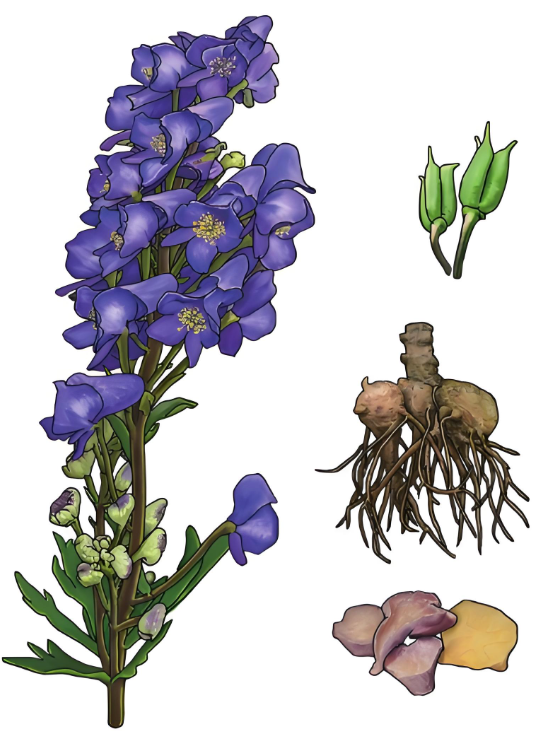 부자는 미나리아재비과 진범이라는 투구꽃의 뿌리입니다. 8-10월경 담자색의 투구 모양의 꽃이 핍니다. 뿌리를 약재로 사용하고, 강한 독성 때문에 이를 독화살에 묻혀 썼다는 이야기도 있습니다. 오두(烏頭) 옆에 자란 자근(子根)을 부자(附子)라고 부릅니다. 그래서 부자의 '부(附)'는 '붙을 부(附)'입니다. 본체는 오두, 옆가지는 부자, 이 둘을 합쳐 초오라고 부릅니다. 셋의 효능은 같지만, 독성에 차이가 있습니다. 비교적 안전한 부자를 취해 쓰는 것이 좋습니다. 부자의 주된 약리 성분은Aconitine입니다. Aconitine의 효능은 세포내 Na⁺ 채널을 지속적으로 활성화시켜 근육과 신경이 잘 흥분될 수 있는 환경을 만들어주어, 마비된 근육과 신경에 쓰면 좋은 효과를 볼 수 있습니다.