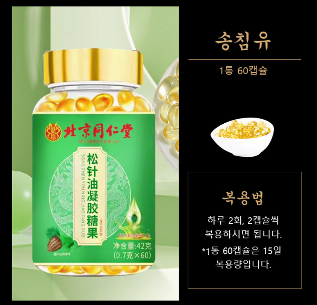 이 제품은 엄선된 청정한 **소나무 잎(솔잎)**만을 사용하여, 솔잎에 담긴 귀한 유효 성분들을 현대적인 증류 및 농축 기술을 통해 고스란히 담아낸 것이 특징이에요. 주로 간편하게 섭취할 수 있도록 캡슐 형태로 출시되였습니다.